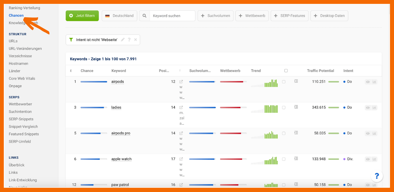 2. Sowohl in Semrush als auch in Sistrix kannst du weitere Filter setzen wie z. B. den Filter Suchintention: Transaktionsorientiert / Intent: Go. Verwende diese, um die Keywords zu identifizieren, die mit geringem Aufwand das größte Umsatz-Potential bieten. Außerdem kannst du nach Suchvolumen sortieren, um dein größtes Traffic-Potential zu finden. Im Bericht Chancen von Sistrix kannst du sogar direkt nach dem Potential filtern.