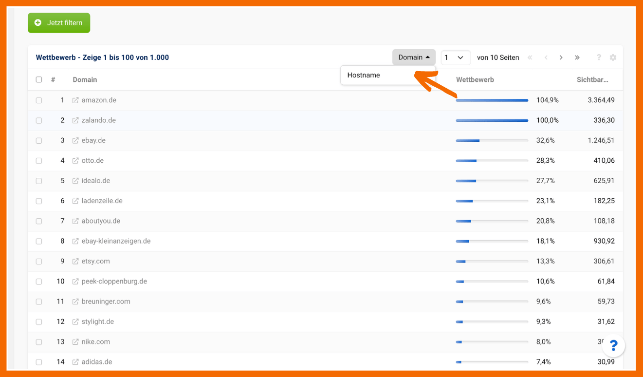 In Sistrix gehst du ähnlich vor. In der Suche gibst du deine Domain ein und klickst anschließend unter SERPS auf Wettbewerber. Wenn du nach unten scrollst, siehst du die Liste deiner Mitstreiter. Als Beispiel haben wir uns hier die zalando.de ausgesucht. Wir haben die Einstellung Domain gewählt, da wir die ganze Domain (zalando.de) analysieren möchten. Wenn du die Einstellung auf Hostname lässt, wird www.zalando.de analysiert. Subdomains wie blog. oder jobs. werden damit von der Analyse ausgeschlossen.