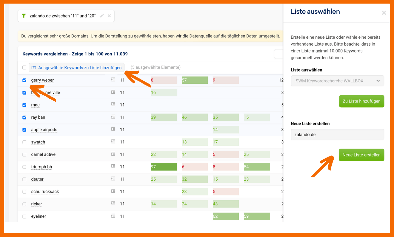 Auch in Sistrix kannst du die relevanten Keywords auswählen und zu einer Liste hinzufügen oder eine neue erstellen.