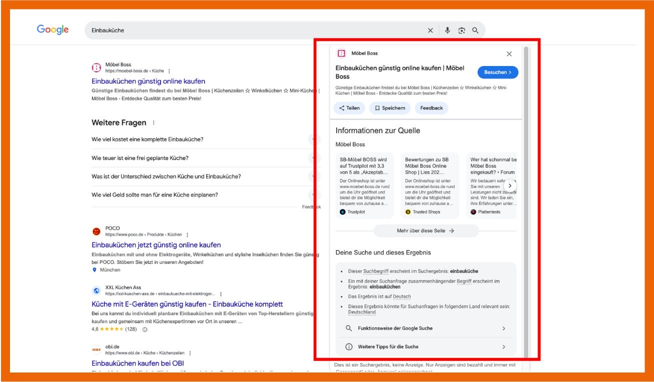 Nun öffnet sich ein weiteres Fenster. In diesem Screenshot siehst du auf einen Blick einige Infos zu dem Suchergebnis von „Moebel-boss.de”. Unter „Informationen zur Quelle” werden Bewertungen des Unternehmens angezeigt, was erkennen lässt: Bewertungen sind für das Ranking von Bedeutung. Außerdem siehst du im Screenshot unter „Deine Suche und dieses Ergebnis”, wie die Suchanfrage mit der Seite zusammenhängt.