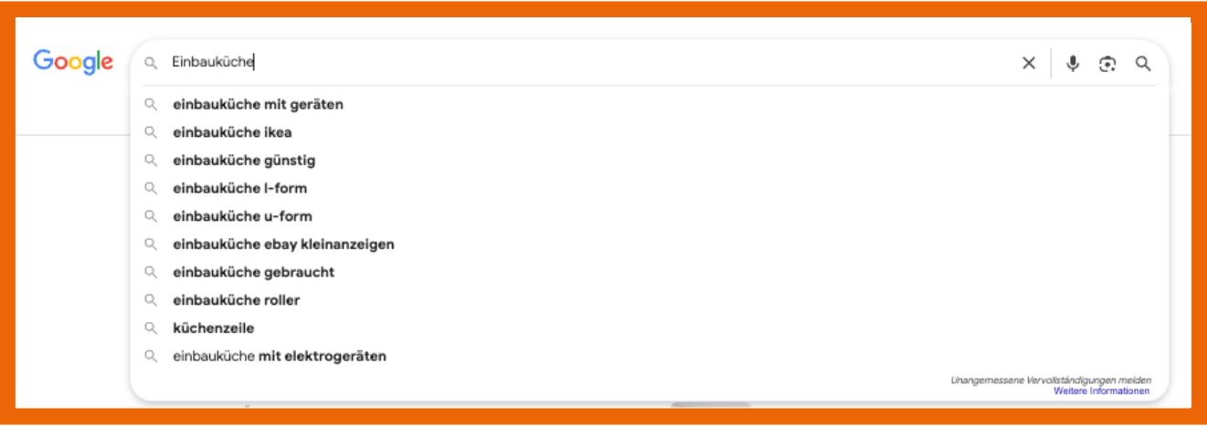 - Themenbereiche zu definieren: Welche Begriffe sind für deine Branche und Produkte relevant? Die Keyword-Vorschläge, welche unterhalb der Suchleiste erscheinen, liefern dir wesentliche Begriffe aus der User-Perspektive.