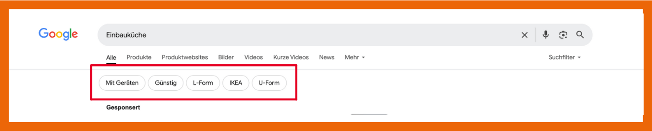 Nach Absenden der Suchanfrage gibt dir Google weitere wertvolle Keyword-Ideen. Besonders spannend sind die Filterfunktionen unter der Suchleiste, die zeigen, wonach Nutzer:innen wirklich suchen.