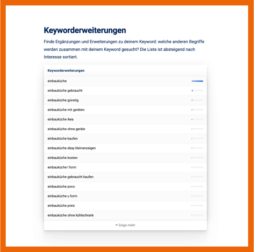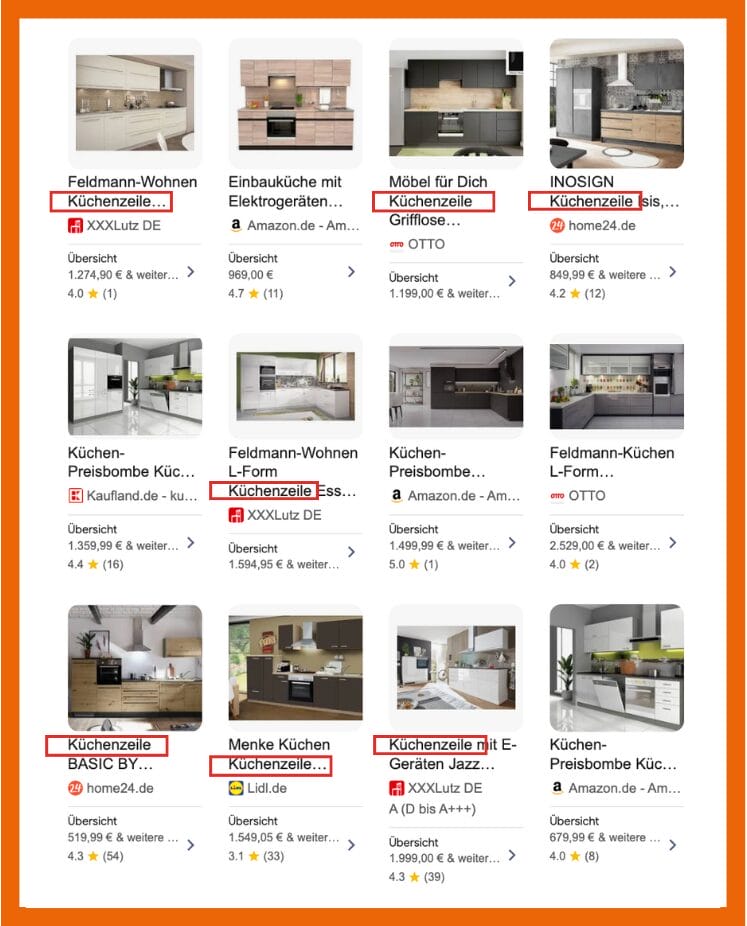 In diesem Screenshot kannst du erkennen, dass das Keyword „Küchenzeile” wiederholt als eines der ersten Keywords in den Produkt-Titeln vorkommt. Daraus können wir schließen: Das Keyword „Küchenzeile” ist für die Google-Suche „einbauküche” relevant und wird bei der Suche erwartet. Daher ist „Küchenzeile” eine wichtige Kategorie. Diese Methode ist sehr hilfreich, wenn du auf der Suche nach weiteren relevanten Keywords und Kategorien bist.