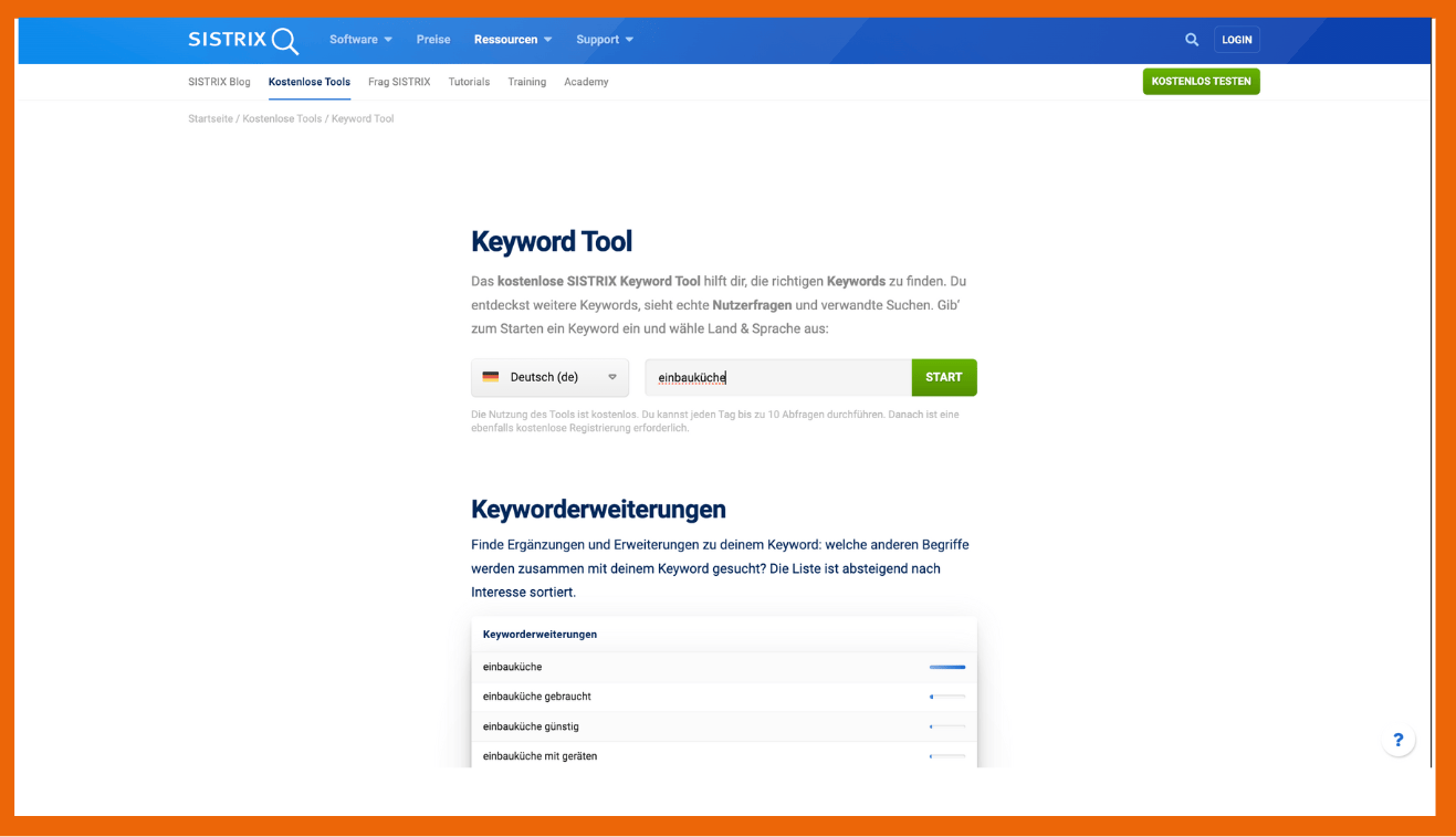 Das kostenlose SISTRIX Keyword Tool bietet dir eine schnelle und unkomplizierte Möglichkeit, neue Keyword-Ideen zu finden. Es zeigt dir das Suchvolumen an, sodass du sofort siehst, wie häufig ein Begriff gesucht wird. Zusätzlich hilft die Wettbewerbsanalyse, um einzuschätzen, wie stark der Konkurrenzdruck für ein bestimmtes Keyword ist.