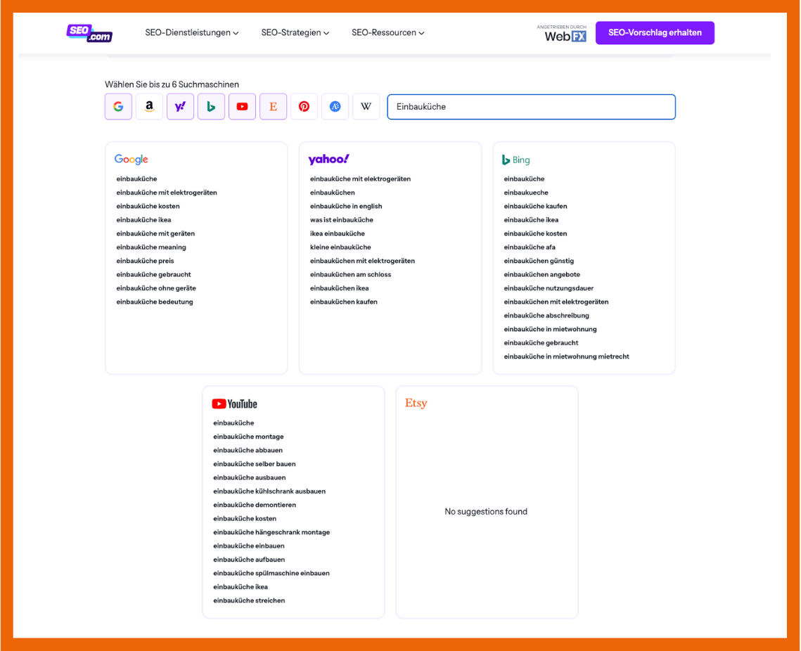 Suggestit.de erweitert das Konzept von Soovle und bietet noch mehr Plattformen für deine Keyword-Recherche. Neben Google und YouTube kannst du auch gezielt Begriffe auf Amazon, Otto, Wer-liefert-was oder dastelefonbuch.de analysieren. Das Tool eignet sich besonders, wenn du Keywords aus verschiedenen Märkten und Sprachen vergleichen möchtest – von Google Deutschland bis Google Japan. Ideal für eine breitere Keyword-Strategie über mehrere Kanäle hinweg.