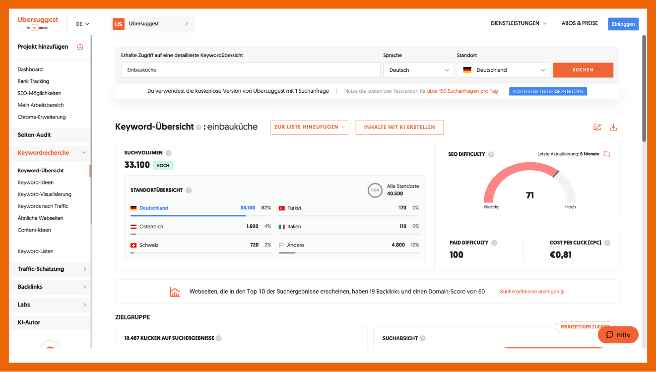 Ein weiteres praktisches Feature ist die länderspezifische Keyword-Suche, mit der du Begriffe gezielt für verschiedene Märkte analysieren kannst. Zudem liefert das Tool verwandte Suchanfragen, die dir helfen, weitere relevante Begriffe für Deine Content-Strategie zu entdecken. Wichtig ist hier zu beachten: Das Tool kannst du kostenlos nutzen und täglich bis zu 10 Abfragen durchführen, mit kostenlosem Login sind es 100.