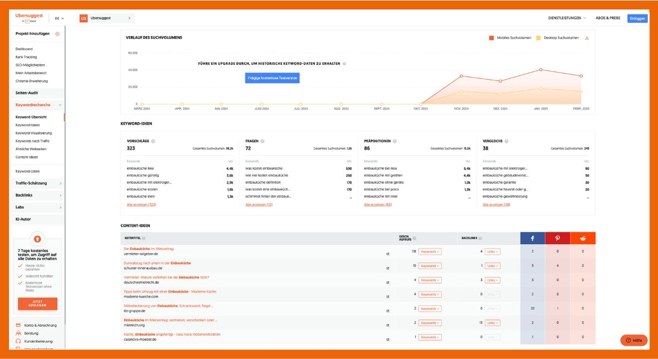 Das kostenlose Keyword-Tool Ubersuggest nutzt Daten von Google Suggest, um eine umfassende Liste an Keyword-Ideen zu liefern. Gibst du einen Suchbegriff ein, erweitert das Tool diesen automatisch um Buchstaben und Zahlen, um noch mehr potenziell relevante Keywords zu finden. Besonders praktisch ist Ubersuggest, wenn du schnell eine thematische Orientierung suchst. Allerdings fehlen hier detaillierte Daten wie Suchvolumen oder Trends, die du eher in kostenpflichtigen SEO-Tools findest. Dort ist die Keyword-Recherche meist nur ein Teil eines umfangreichen Analyse-Werkzeugs.
