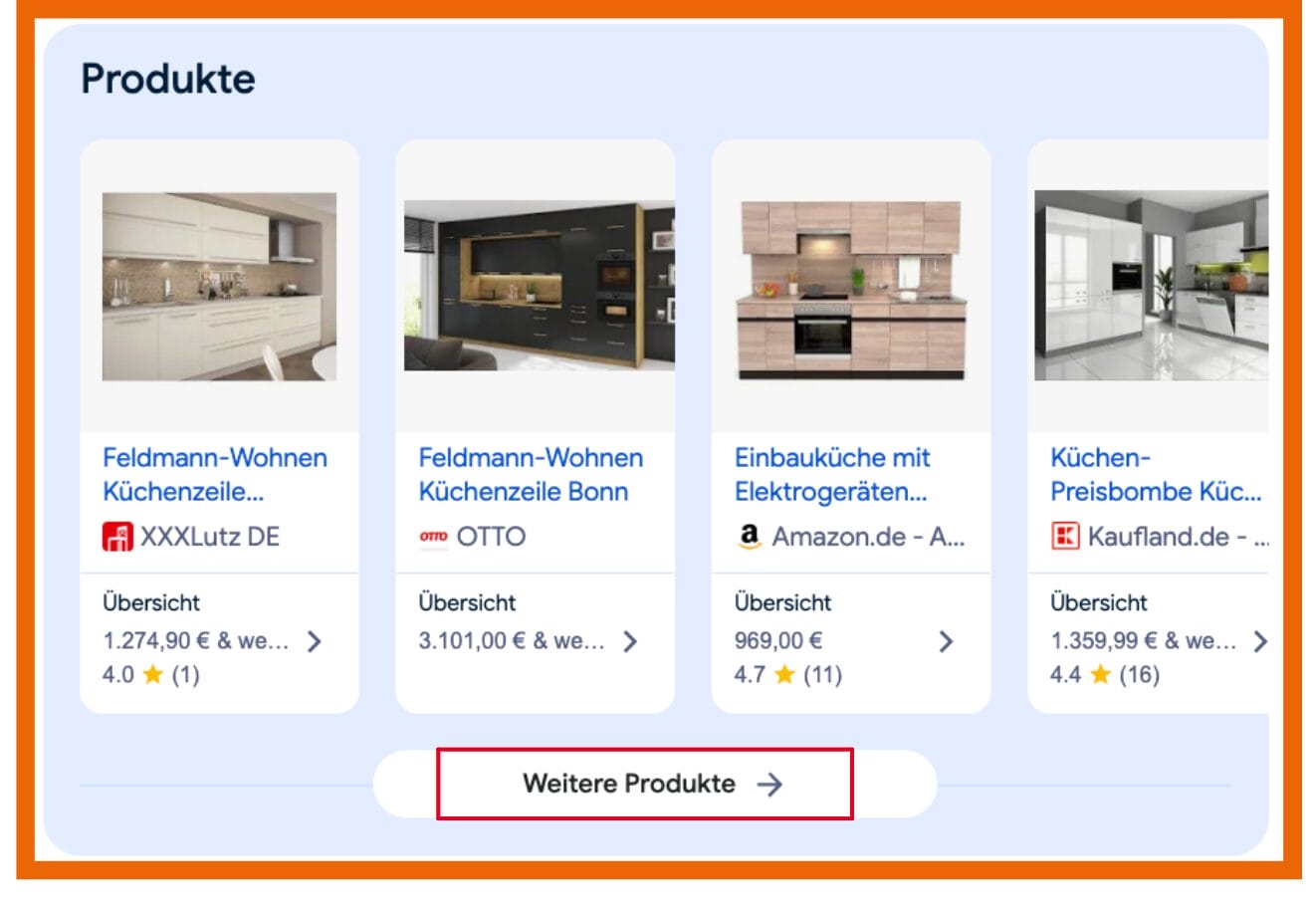 Diese organischen Shopping-Ergebnisse zeigen die Relevanz des Keywords „Küchenzeile” für die Google-Suche zum Begriff „Einbauküche”.