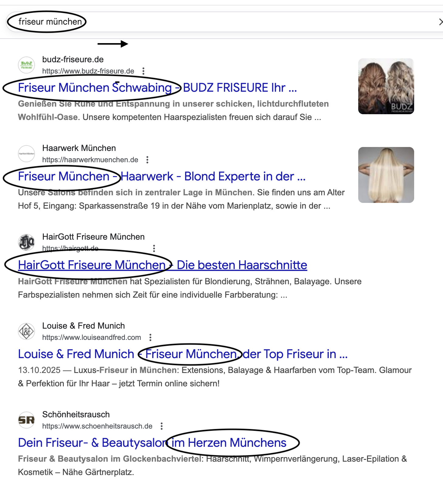 • Suchintention: Wird nach Informationen, einer Dienstleistung oder direkt einem Anbieter gesucht? („Friseur München“ vs. „Friseurtermin buchen München“)