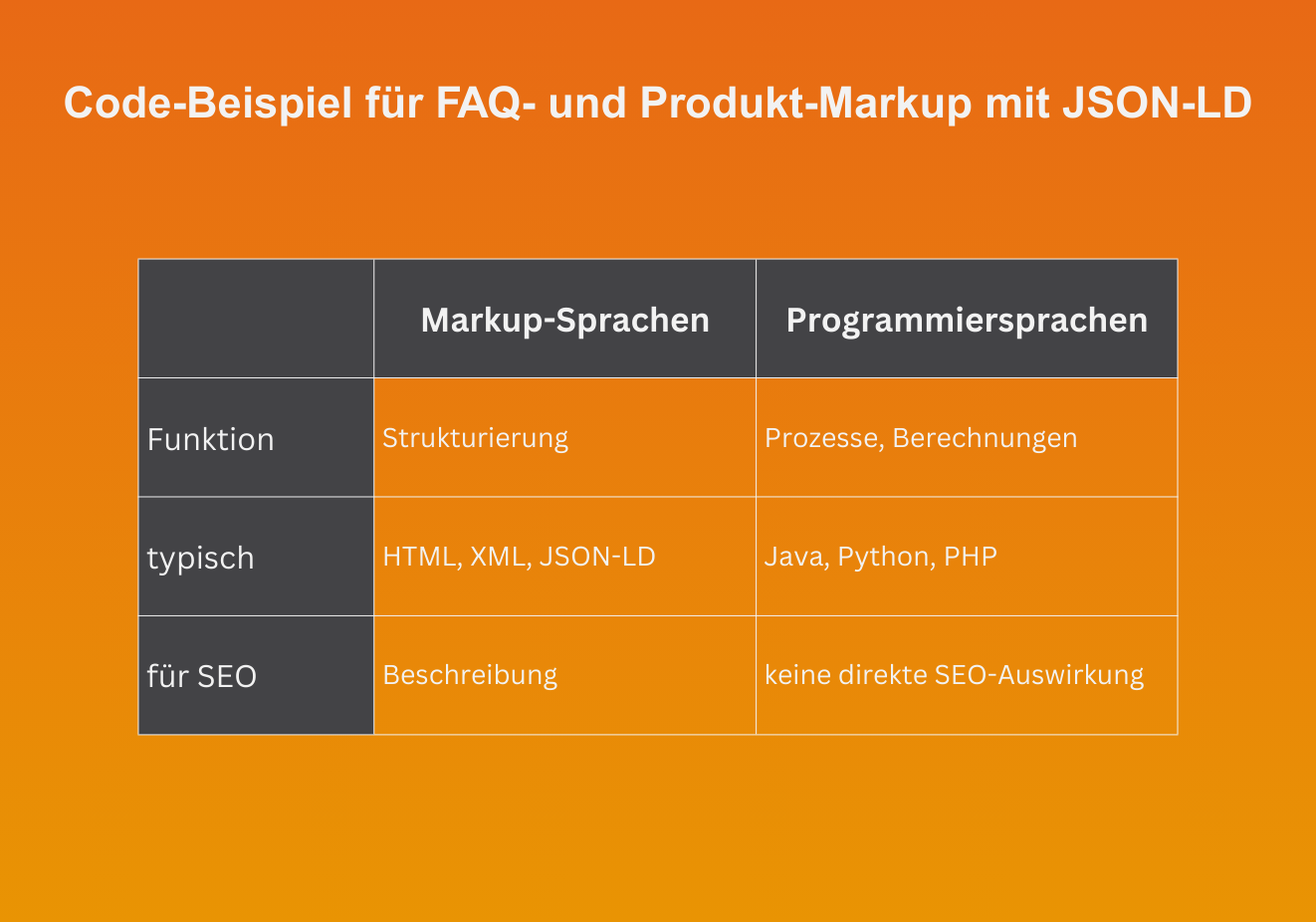 Hier werden Begriffe oft verwechselt. Markup-Sprachen (z.B. HTML, XML, JSON-LD) sind deklarativ und strukturierend: Sie beschreiben den Aufbau und die Bedeutung von Inhalten, ohne Abläufe zu steuern. Im Gegensatz dazu sind Programmiersprachen (z.B. Java, Python, PHP) imperativ: Sie geben Computerprozesse und Berechnungen vor.