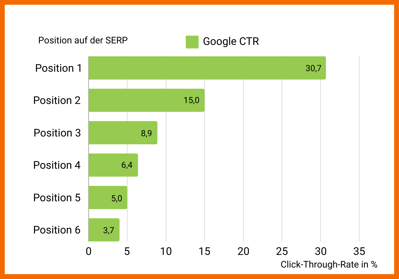 Bitte beachte, dass es sich hierbei aber nur um grobe Richtwerte handelt und die CTR von Branche zu Branche unterschiedlich ausfallen kann. Vor Allem mit den aktuellen Entwicklungen auf der SERP (wir berichten), kann die CTR für organische Ergebnisse nochmal deutlich niedriger ausfallen.