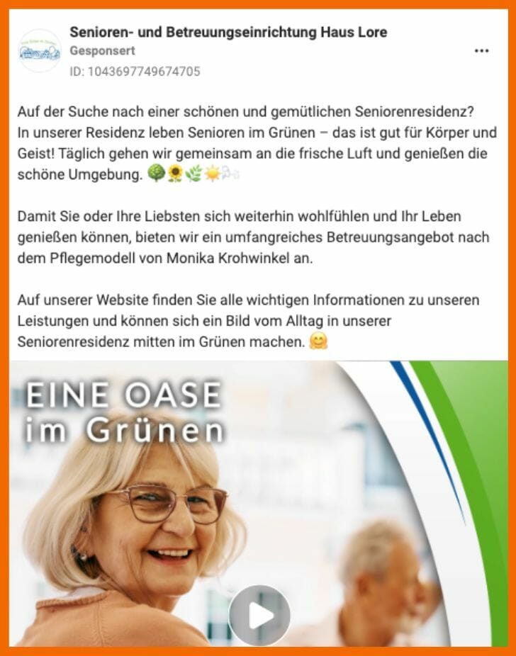 Um im Anzeigentext den Aspekt des Alters dennoch aufzugreifen, musst du das persönliche Element herausnehmen. Hier findest du ein Beispiel von der Senioren- und Betreuungseinrichtung Haus Lore: