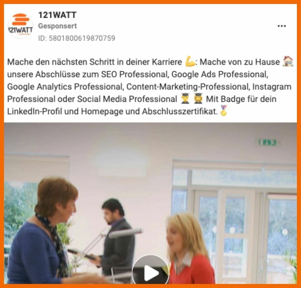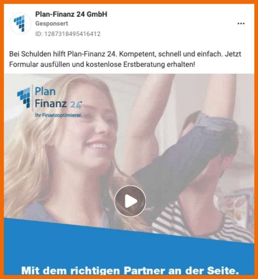Meta verbietet es Werbetreibenden nicht, für Produkte und Dienstleistungen zu werben, die bei finanziellen Schwierigkeiten helfen. Aber du darfst nicht andeuten, dass du den finanziellen Status deiner Zielgruppe kennst. Du darfst zum Beispiel nicht fragen: „Möchtest du die Insolvenz anmelden?“. Beschreibe stattdessen das Produkt oder die Dienstleistung deines Unternehmens näher. Du kannst beispielsweise folgende Formulierung verwenden: „Unsere Finanzprodukte helfen beim Umgang mit Schulden.“ Hier haben wir noch ein Beispiel von der Plan-Finanz 24 GmbH für dich: