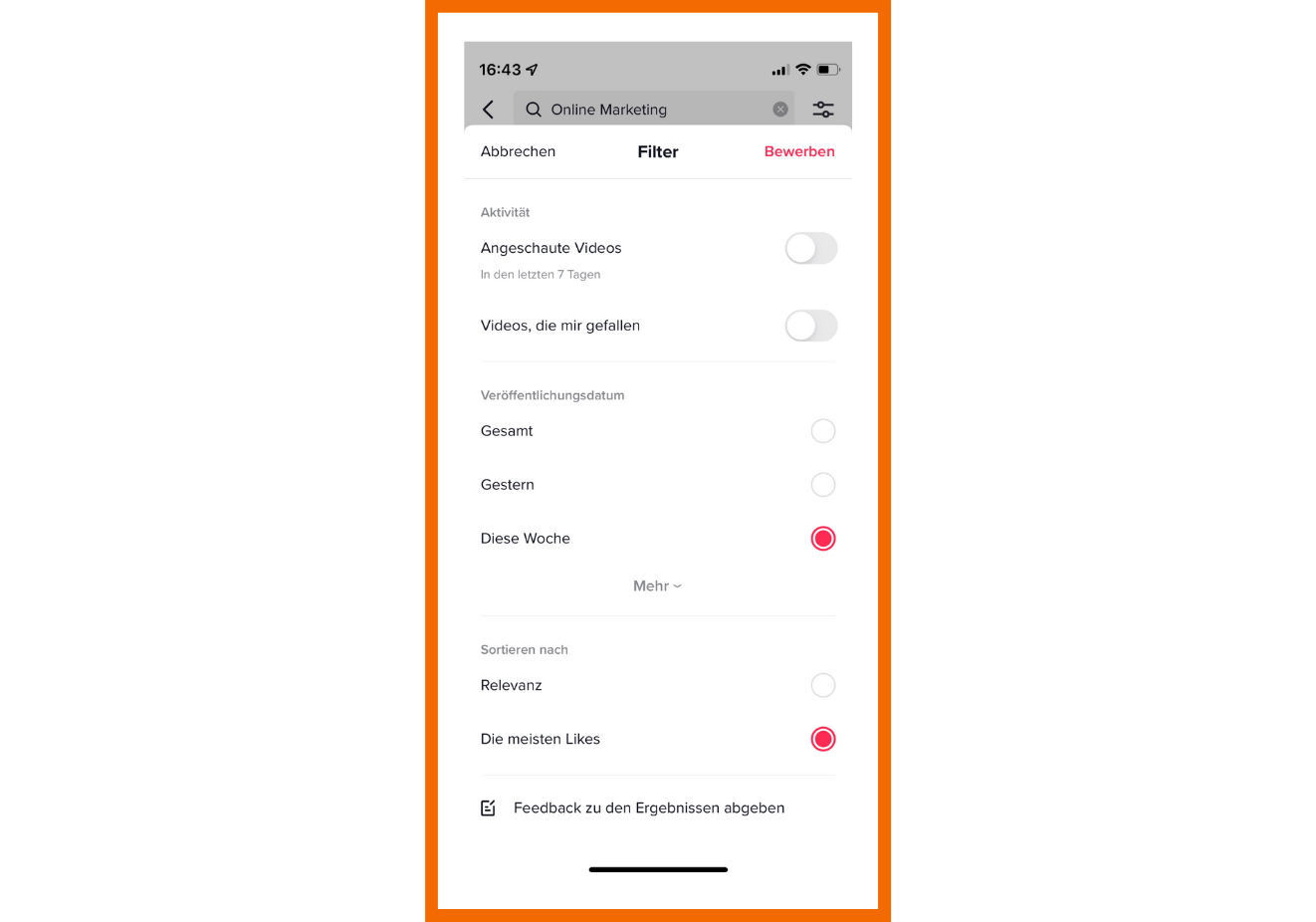 Lege dir einen separaten TikTok-Account für die Recherche an. Besuche die Entdecken-Seite, suche dort nach Keywords aus deiner Nische und filtere nach den erfolgreichsten Clips der letzten Woche. So erfährst du, welche Videos deiner Zielgruppe besonders gefallen haben. Nun kannst du anfangen, anderen Creator:innen zu folgen, mit ihren Videos zu interagieren und weitere Accounts zu deinem Thema zu finden. Damit trainierst du den Algorithmus und bereits nach wenigen Tagen findest du auf deiner For You-Page viele Beiträge, von denen du lernen und dich für deine Anzeigen inspirieren lassen kannst.