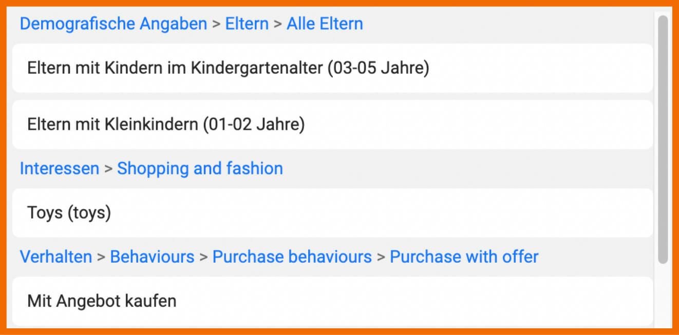 Du siehst, dass es viele Möglichkeiten gibt, bestimmte Personas auf anderem Wege zu erreichen. Probiere dich also aus und entdecke neue Wege, deine Zielgruppe zu erreichen. Zudem kannst du diese Optionen miteinander kombinieren, um näher an deine gewünschte Zielgruppe zu gelangen. Wie würdest du zum Beispiel vorgehen, um ein Angebot für Spielzeuge für Kleinkinder im Alter von eins bis fünf Jahren zu vermarkten? Verwende hierfür beispielsweise diese Targeting Optionen: