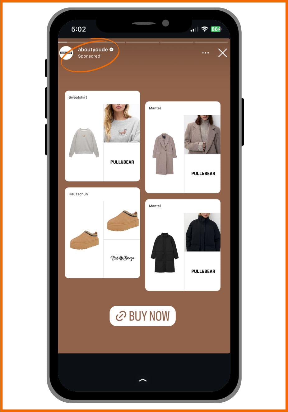 AboutYou bewirbt seine Auswahl für den Herbst über gesponserte Instagram Stories und erreicht so gezielt Nutzer:innen, die sich für Mode und aktuelle Trends interessieren.