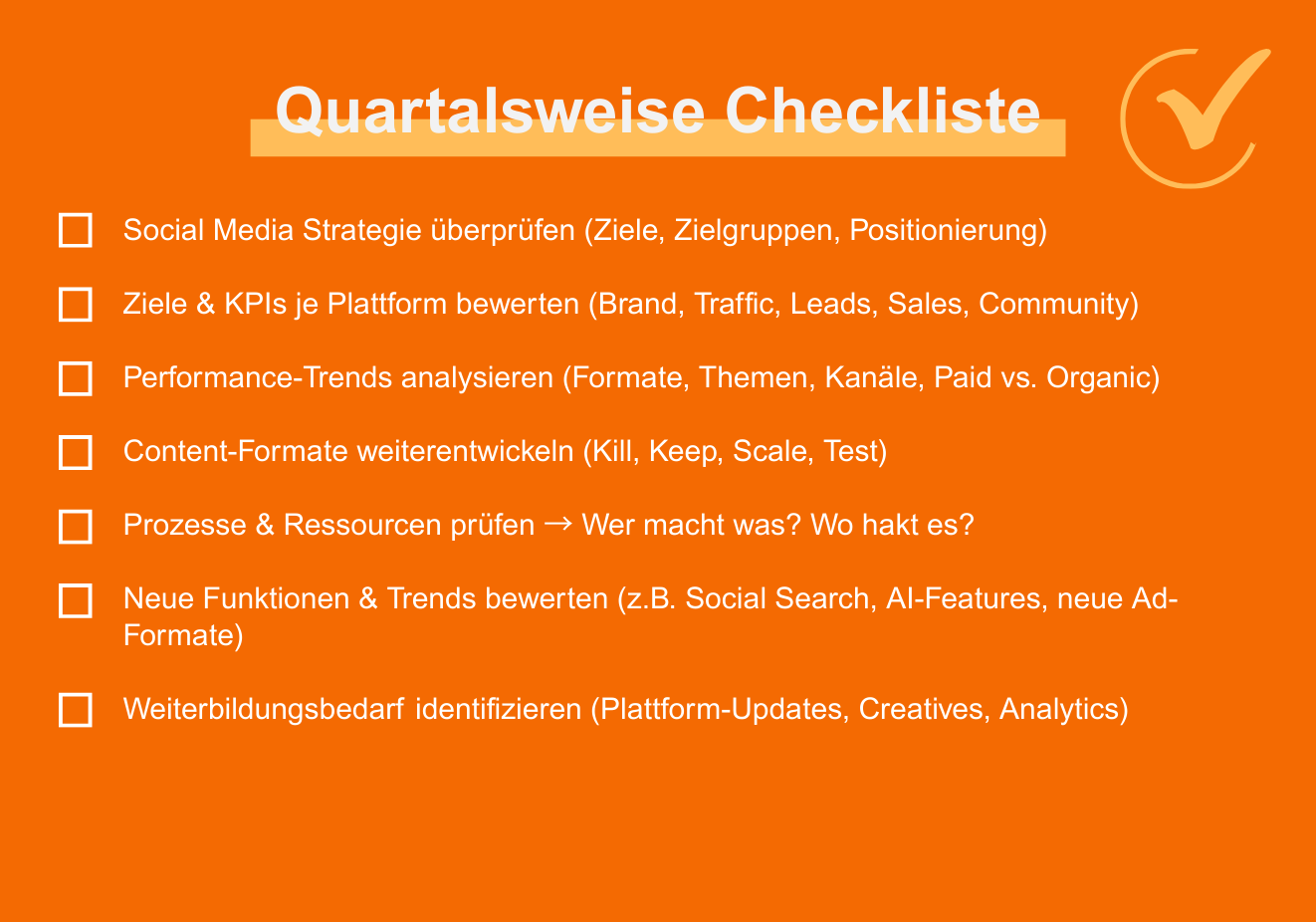 • Quartalsweise Reviews stellen sicher, dass Strategie, Prozesse und Trends zusammenpassen.