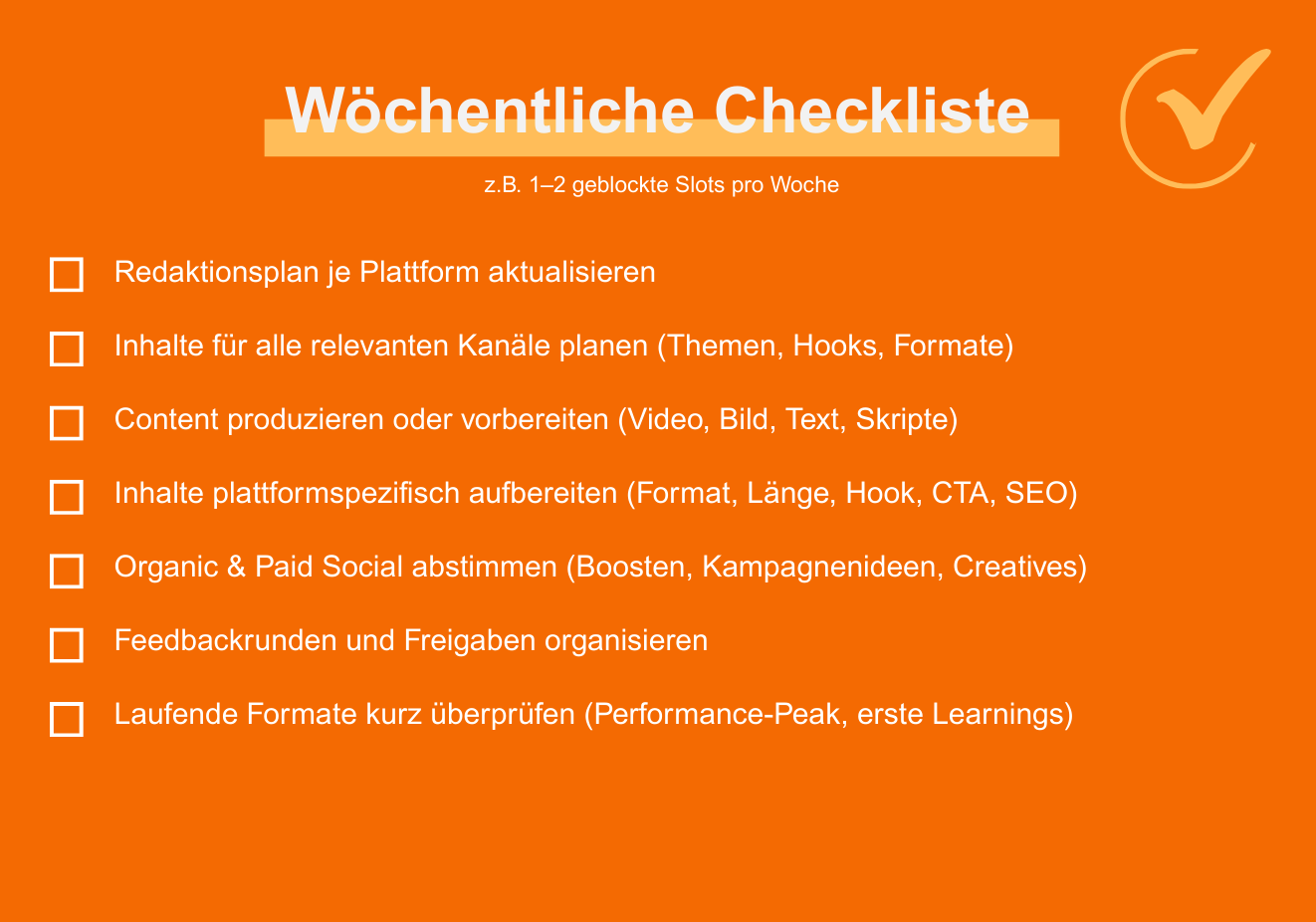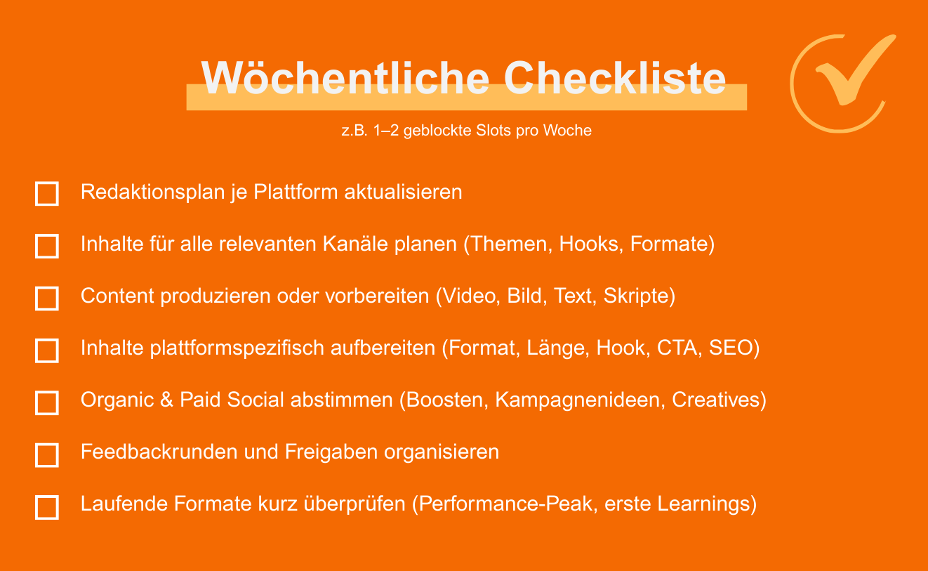 • Wöchentliche Planung sorgt für Konsistenz und plattformspezifisch starken Content.