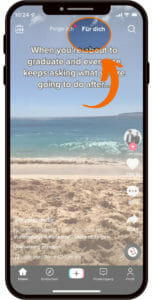 Im deutschen TikTok heißt diese Seite Für Dich-Seite (Screenshot 2) und sie ist vergleichbar mit der Entdecken-Seite von Instagram. Dort spielt TikTok dir Videos aus, die der Algorithmus als für dich passend erachtet. Diese Auswahl basiert auf deinem gesamten vorherigen Verhalten in der App und bezieht dein komplettes Engagement mit ein. Entdeckst du dort ein Video, welches mehrere hunderttausende Likes hat, kann es sich lohnen, hier genauer hinzusehen: Steht dieses Video im Zusammenhang mit einem bestimmten Trend? Indem du rechts unten auf das Sound-Symbol tippst, gelangst du zur Übersicht über diesen bestimmten Sound und kannst herausfinden, wie beliebt diese Audio-Sequenz auf TikTok ist.