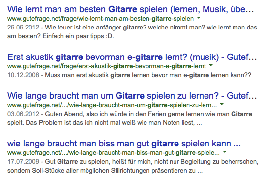 Gutefrage und Co. sind wahre Goldgruben für neue Content Ideen. Meist ist das ein erster guter Anlaufpunkt, wenn es um Ideen für Inhalte geht. Hättest du zum Beispiel einen Shop für Gitarren, würdest du Folgendes in den Google-Suchschlitz eingeben: