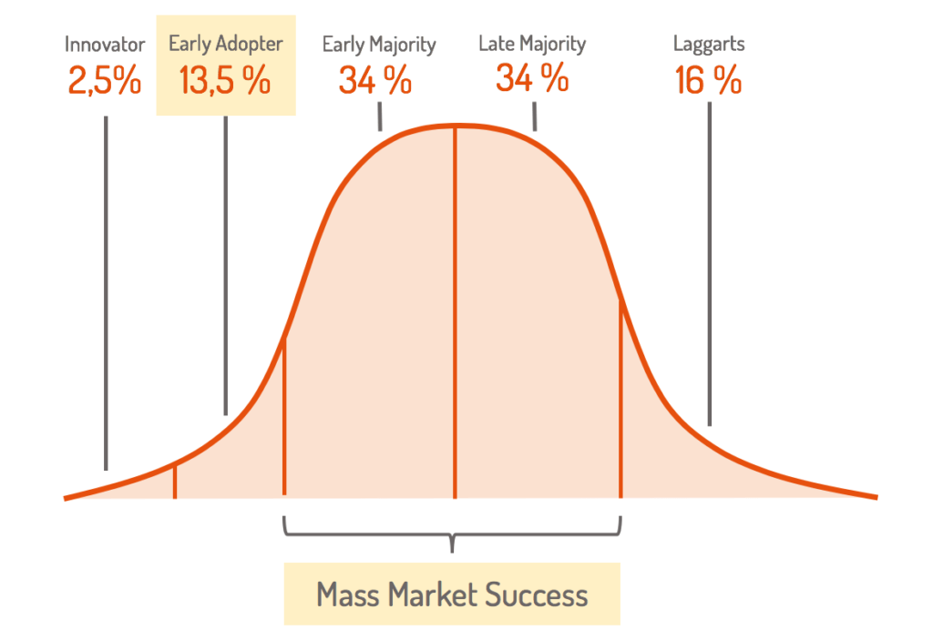 Wen gilt es nun zu erreichen? Um die breite Masse zu erreichen, musst du zunächst die Early Adopters überzeugen. Sie kaufen Produkte nicht nach Verfügbarkeit, sondern weil sie genau an das glauben, woran du als Innovator glaubst. Ihnen musst du zeigen, dass dein Produkt die Welt zu einer besseren macht. Erst wenn du die Early Adopters auf deiner Seite hast, kannst du dich an die breite Masse machen. Sie kaufen ein Produkt weniger aus Überzeugung, sondern weil das Produkt sich bereits bei vielen Menschen (den Early Adopters) bewährt hat. Diesen Sprung schaffen nicht viele Unternehmen, aber wenn du ihn schaffst, dann spielst du oben mit und kannst große Erfolge feiern.