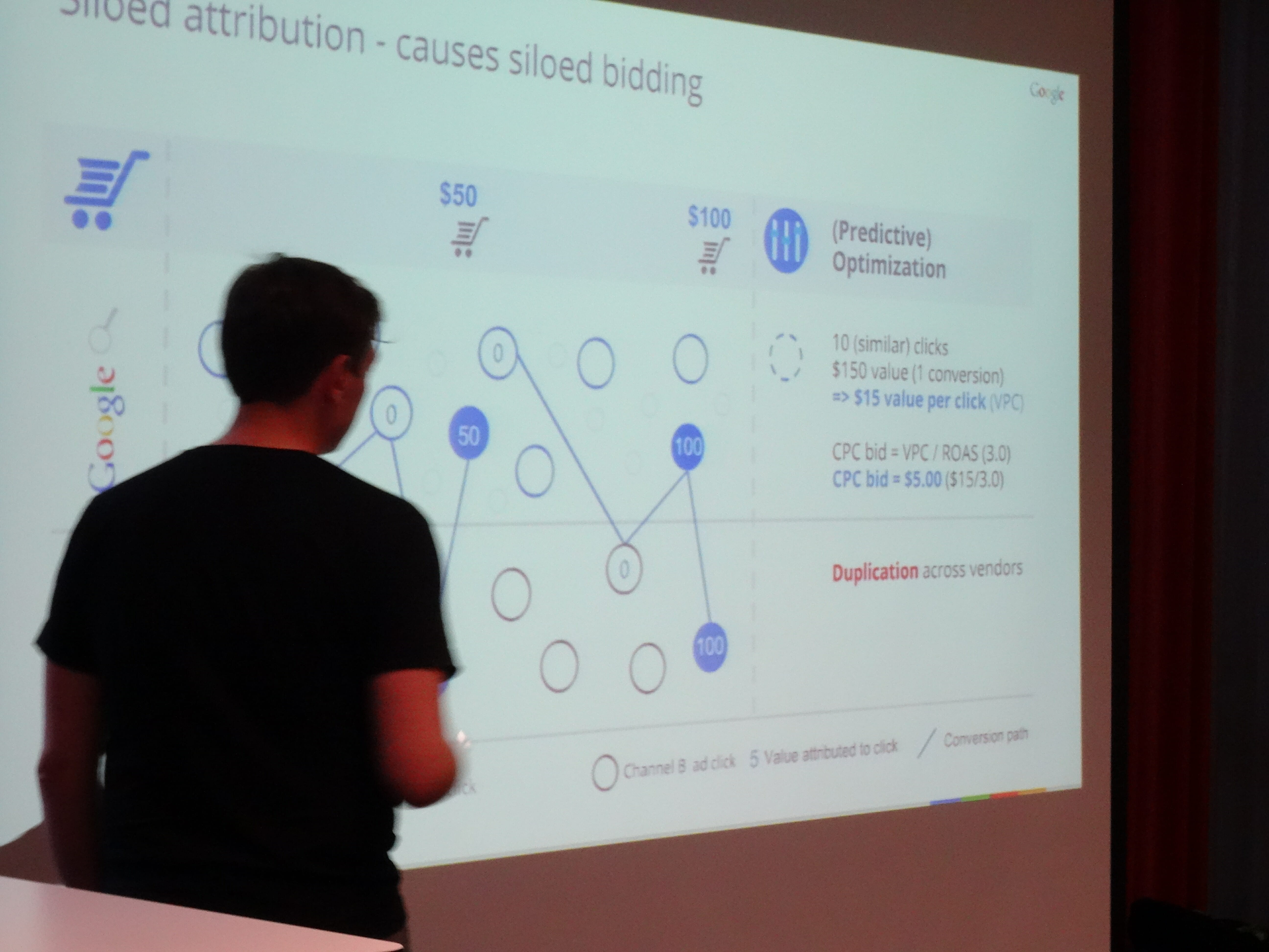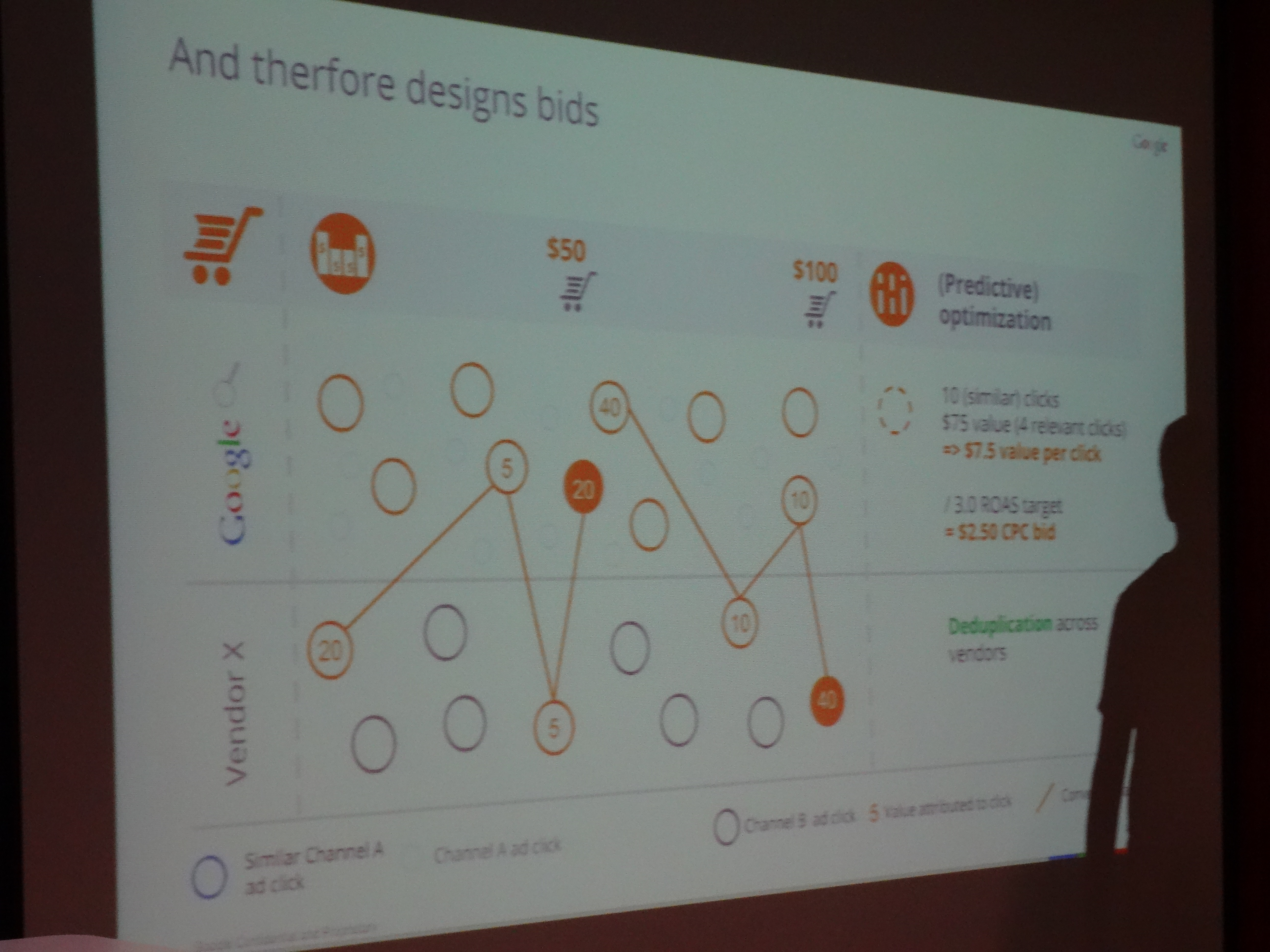 Getreu dem Motto: das Beste kommt zum Schluss, hielt unser „special guest“ Matthias Cada von Google den abschließenden Vortrag. Er erklärte uns die Wichtigkeit von „Attribution“. Doch was ist Attribution genau, magst auch Du Dich fragen? Durch Attribution kann man einem jeden Marketingkanal einen bestimmten Wert zuweisen. Dieser Wert spiegelt im Idealfall die Relevanz und Wichtigkeit dieses Kanals bei der Generierung von Conversions wieder. Google feilt diesen Prozess der Wert-Zuweisung momentan immer weiter aus, um eine bessere Grundlage für Budgetentscheidungen im Marketing zu schaffen. Wenn Du weißt, wie viel ein jeder Kanal (TV, AdWords, Facebook, etc.) genau zu einer Conversion beiträgt, dann kannst Du viel effektiver auf Anzeigenplätze bieten. Um dies genauer darzustellen hatte Matthias Cada den Vergleich zwischen einem einfacheren und fortgeschrittenen Attribution Model mitgebracht. Im zweiten Fall siehst Du, dass die Attribution granularer gemessen wurde und somit eine ganz andere Budgetforderung zuließ:
