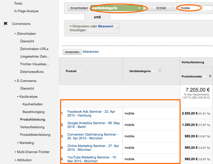 Google Analytics Conversion Report - was kaufen mobile Nutzer