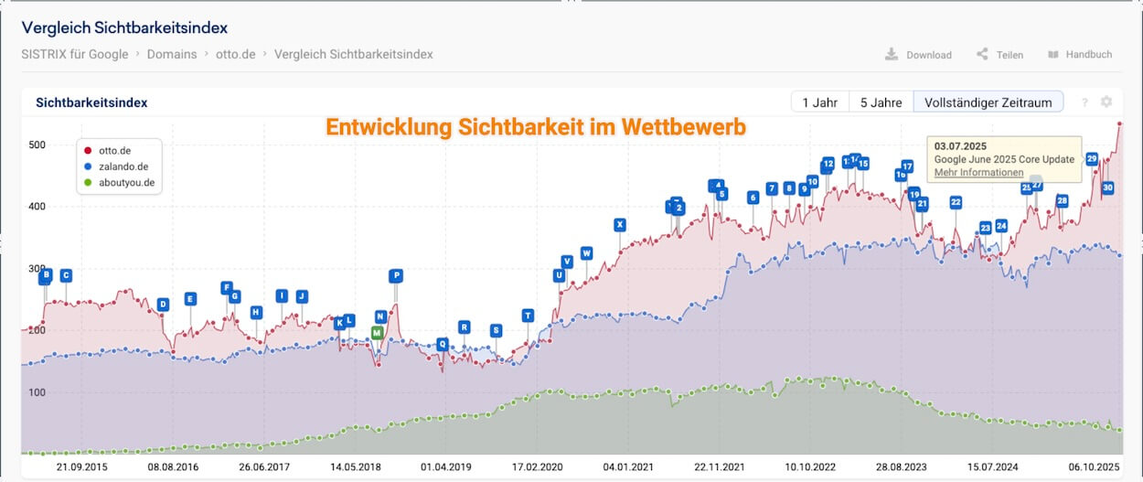 - Monitoring & Kennzahlen: Essentiell für den nachhaltigen SEO-Erfolg sind die regelmäßige Analyse von Daten aus z.B. der Google Search Console, GA4, Sistrix und inzwischen auch Tools zur AI‑Sichtbarkeit, wie das Sistrix AI/Chatbot Research Tool oder Tools, wie Peec AI, Otterly oder Rankscale . Zu den wichtigsten SEO-Kennzahlen gehören Impressionen, Klicks, CTR, Positionen, Sichtbarkeit oder Zitationen aus der AI-Search